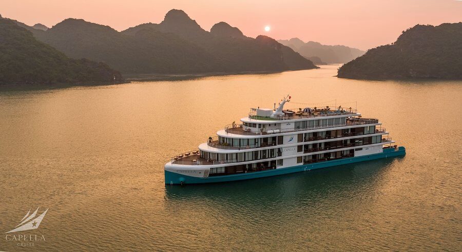 In the afternoon, Capella anchors for outdoor activities on the Ao Ech. Numerous entertaining facilities are available, listed as seasonal swimming pool, jacuzzi, floating ocean pool, inflatable water slide, kayak. Alternatively, you can bask in the warm sunlight on the Ocean Sky sundeck or relax at the mini-golf course. At dusk, you are invited to join Sunset Happy hours (Buy 2 get 1 free) at the Spirit of the Sea Lounge and the sundeck area. You will be feasted on freshly prepared canapés with some complimentary exotic drinks while waiting for the dark orange sunset. Moreover, don’t miss the fun cooking demonstration with the guidance of talented chefs.