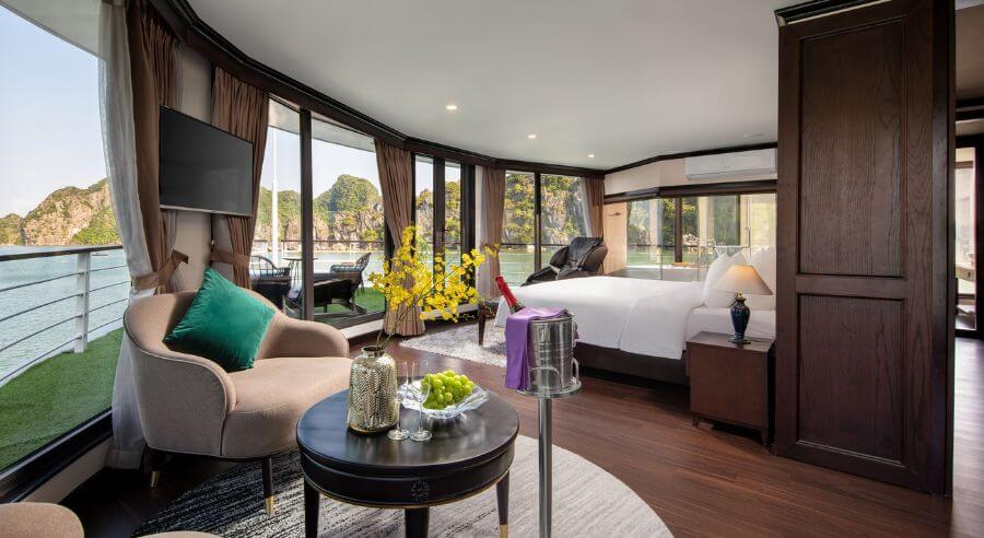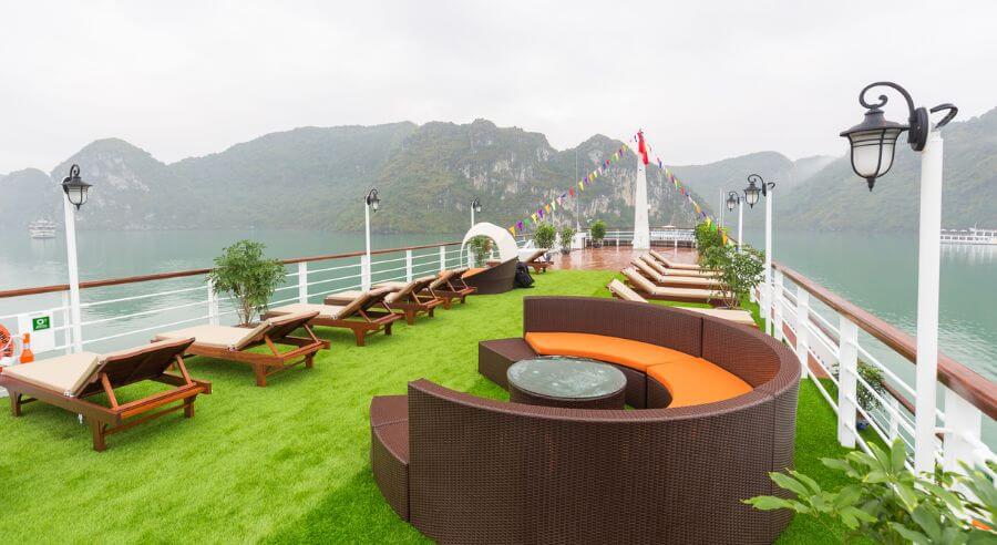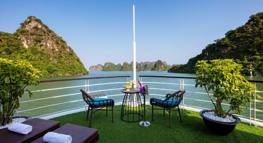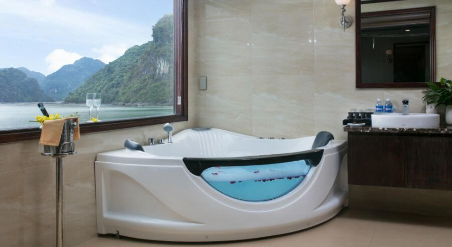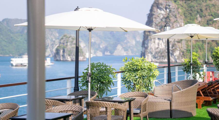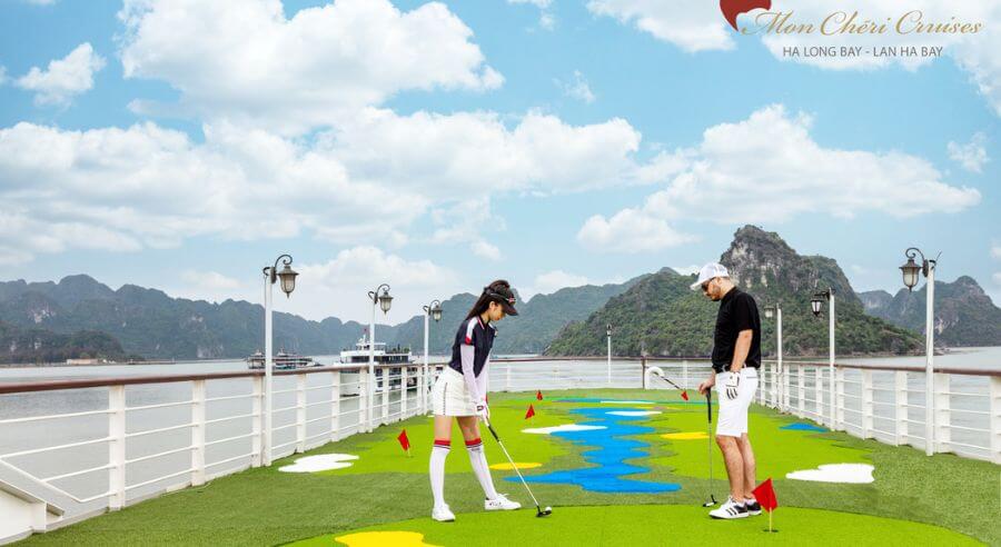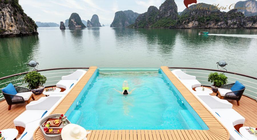 Mon Cheri Cruise accesses Tra Bau Area where guests can kayak to enjoy the stunning view of Lan Ha Bay. Afterward, guests cannot miss swimming activity in the blue-jaded seawater or soaking in the outdoor jacuzzi pool of the cruise.