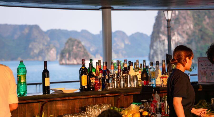 Return to the boat and head up to the top deck to watch the magnificent sunset over the Gulf of Tonkin. Join the cooking demonstration with traditional food and Happy Hour – BUY ONE GET ONE FREE at the bar.