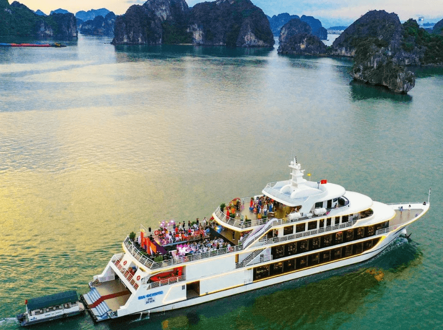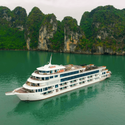 The cruise returns to the coastal area and docks at the International Port of Ha Long. While waiting, guests can enjoy afternoon tea accompanied by music at The Echo Bar on the cruise and admire the beauty of Ha Long Bay in the evening light.